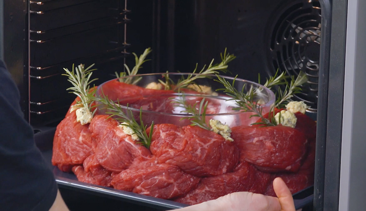 3. Für die Kräuterbutter vermischst du weiche Butter mit Knoblauch, Thymian, Rosmarin, Salz und Pfeffer. Belege das Fleisch mit dann mit der Kräuterbutter sowie mit Rosmarinzweigen. Würze außerdem mit Salz und Pfeffer. Schiebe das Blech für 15 Minuten bei 220 °C Umluft in den Ofen. Reduziere dann die Temperatur auf 160 °C und lasse das Fleisch weitere 10 bis 15 Minuten garen. Lasse das Fleisch anschließend mindestens 15 Minuten bei Raumtemperatur ruhen. Fange den Fleischsaft auf und stelle ihn erst einmal beiseite.