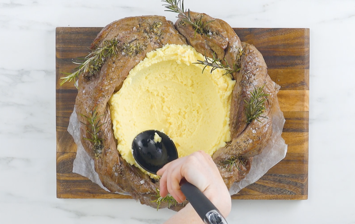 6. Lege Backpapier auf ein Holzbrett und platziere darauf den gegarten Fleischring. Verteile in der Ringmitte den Kartoffelbrei und streiche ihn glatt, sodass eine Kuhle entsteht.