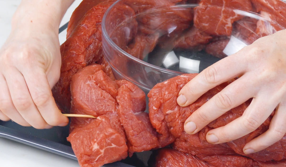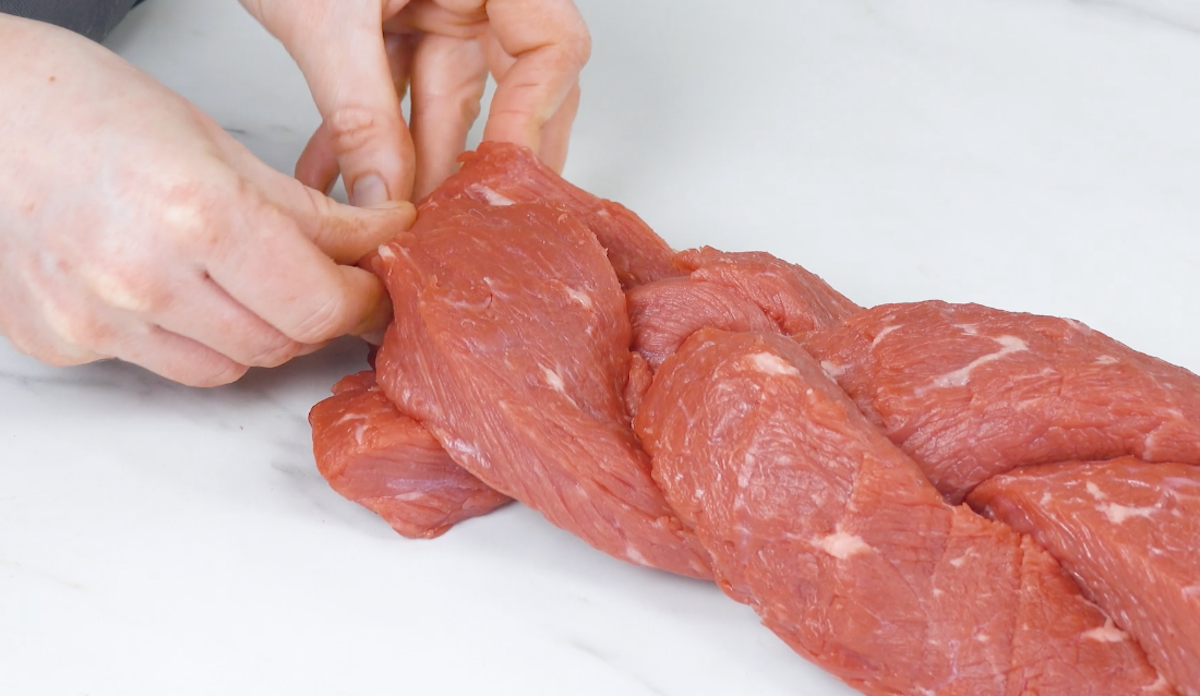 1. Entferne vom Fleisch das Fett und die Sehnen und halbiere das Fleischstück dann längs, sodass du es aufklappen kannst. Es sollte ungefähr 130 cm lang sein. Schneide das Fleisch 2-mal ein, sodass 3 Stränge à 5 cm Breite entstehen. Flicht die Stränge zu einem Zopf. Achte dabei darauf, dass keine Lücken entstehen, und fixiere den Fleischzopf dann mit einem Holzstäbchen.