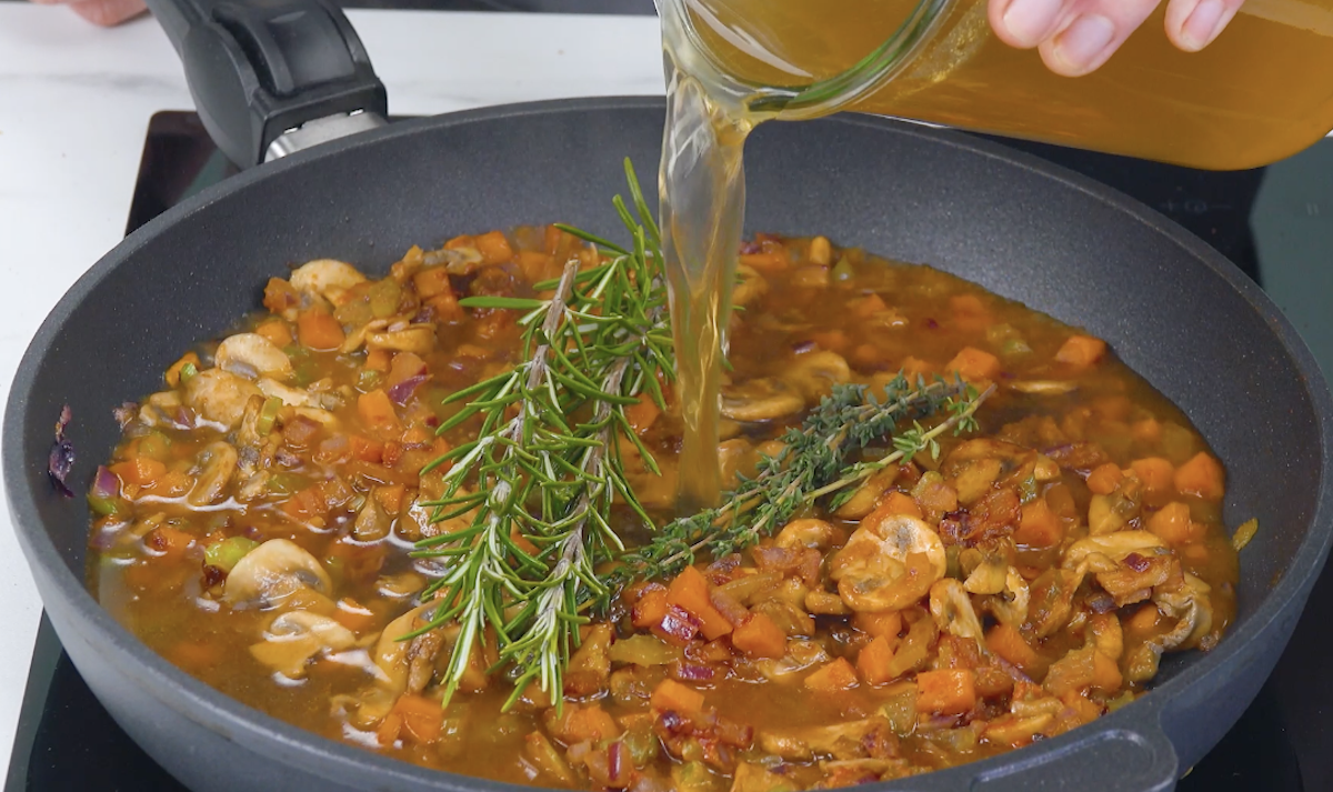 5. Brate Zwiebeln, Champignons, Karotte und Sellerie in Öl an. Gib dann Balsamico, Rosmarin, Tomatenmark und Senf hinzu. Gieße dann nach und nach die Rinderbrühe in die Pfanne und lasse alles so lange kochen, bis die Soße leicht eindickt.