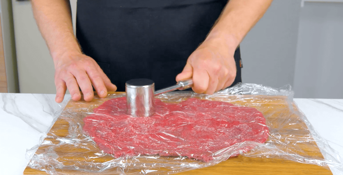 1. Verbreitere das Fleisch mit einem Schmetterlingsschnitt. Platziere es dann zwischen zwei Lagen Frischhaltefolie und plätte es.