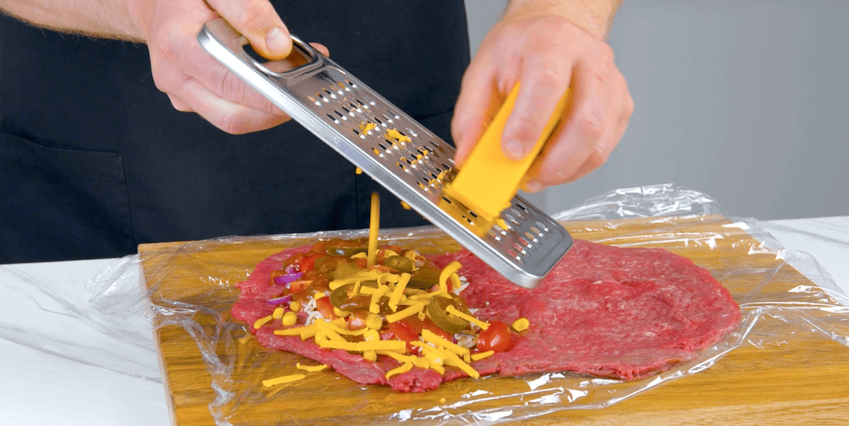 2. Entferne die obere Frischhaltefolie und belege eine Hälfte des Rindfleischs mit Mozzarella, Zwiebeln, Tomaten, Mais und Jalapeños. Verteile Salsa darüber und bestreue alles mit Cheddar.