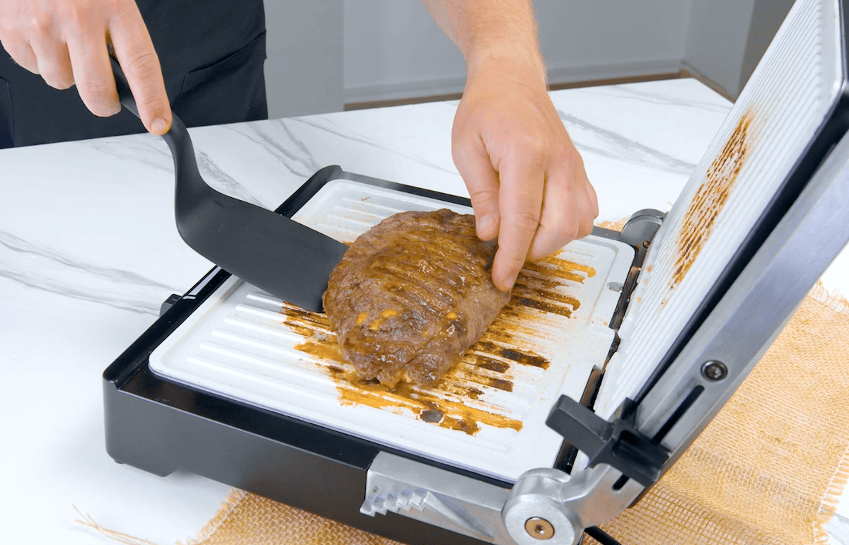 3. Klappe das Rindfleisch zusammen. Stelle den Kontaktgrill auf die höchste Stufe und gare das Fleisch darin für 10-12 Minuten. Lass es anschließend 5 Minuten abkühlen.