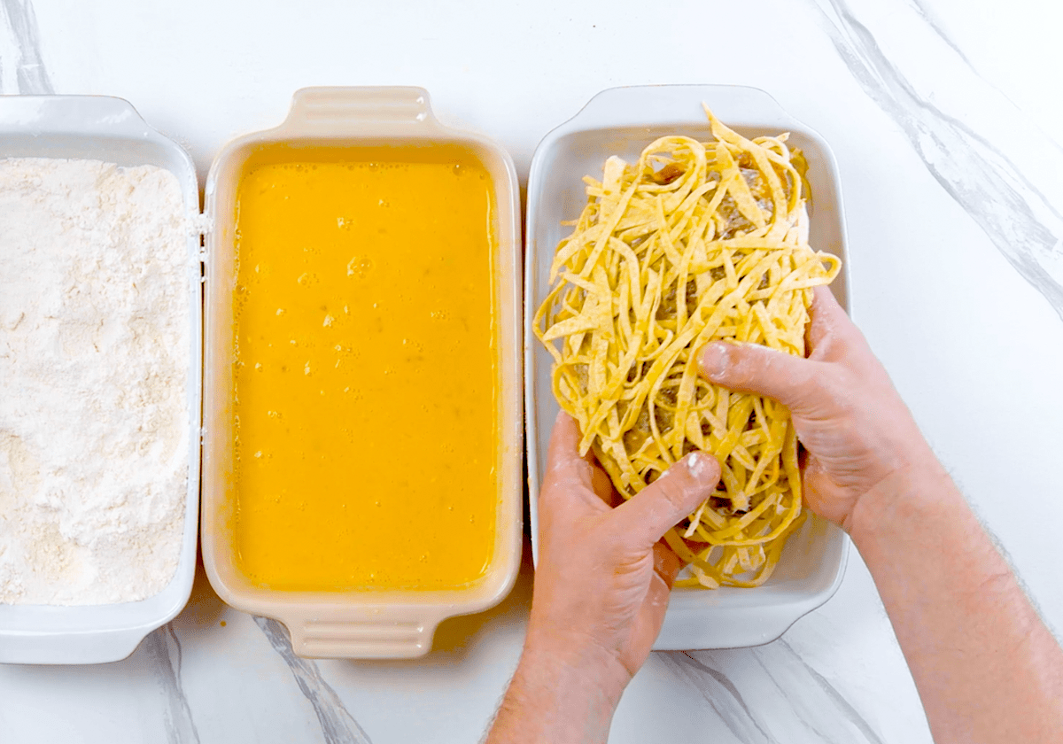 5. Paniere das Fleisch nacheinander in Mehl und Eiern und wälze es zum Abschluss durch die Tortilla-Streifen.