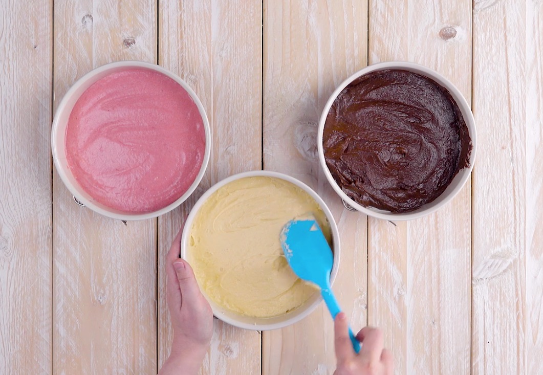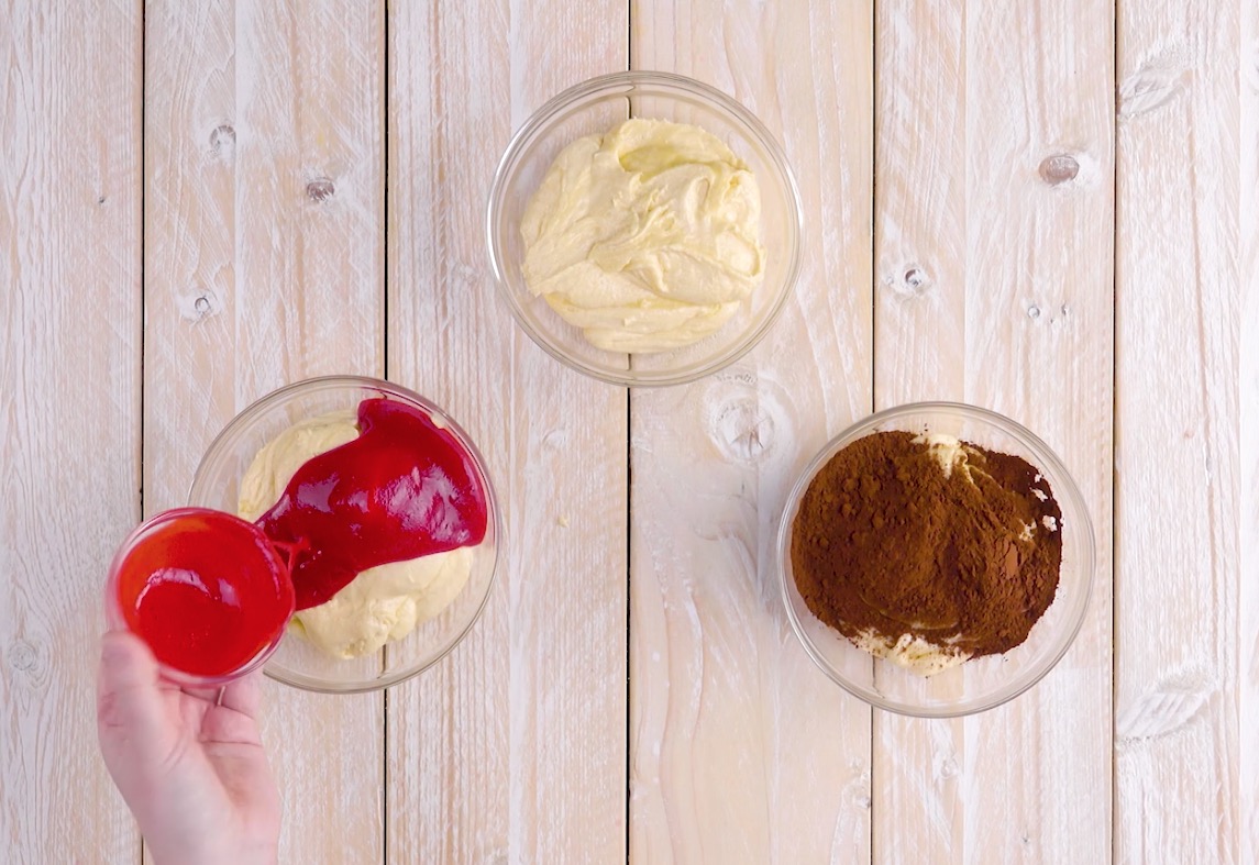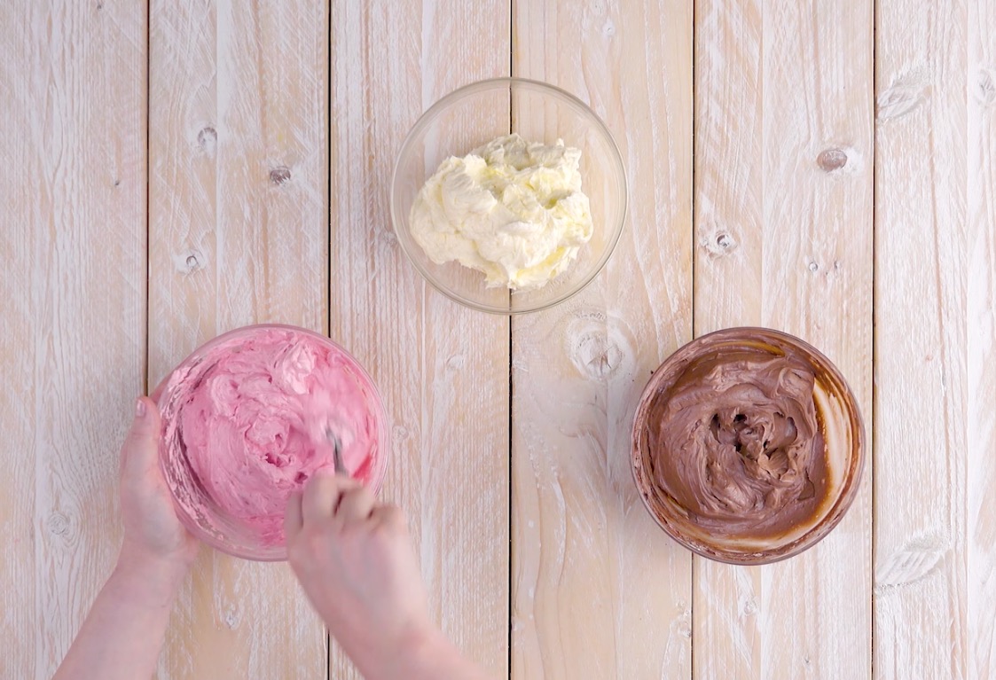 Verteile die Creme wie zuvor den Teig zu gleichen Teilen auf drei Schüsseln. Verrühre einen Teil davon zusätzlich mit 3 EL Erdbeerpüree und einen weiteren mit Kakao.