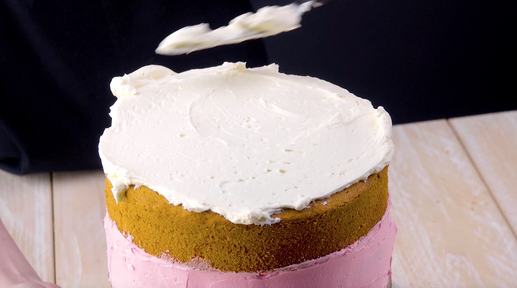 5.) Setze nun den Schokokuchenboden auf eine Kuchenplatte und streiche ihn oben und um den Rand herum mit zwei Dritteln der Kakaobuttercreme ein. Setze den Erdbeerkuchenboden darauf und streiche diesen mit zwei Dritteln der Erdbeerbuttercreme ein. Als oberste Lage setzt du den letzten Teigboden auf die beiden anderen. Verteile wie bei den anderen die weiße Buttercreme darauf, aber nimm nur etwa die Hälfte davon zum Bestreichen.