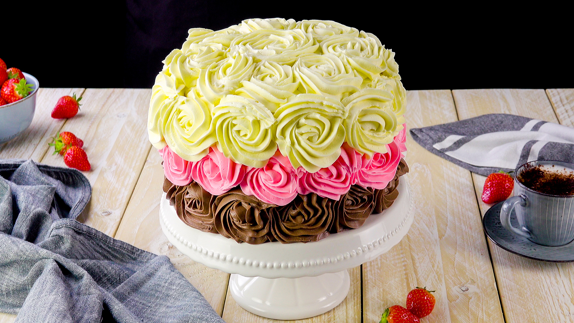 Mit diesem Rezept kannst du eine Creme-Torte auf den Tisch bringen, die durch ihr Rosen-Bukett so schön ist, dass man sich die restliche Deko sparen kann.