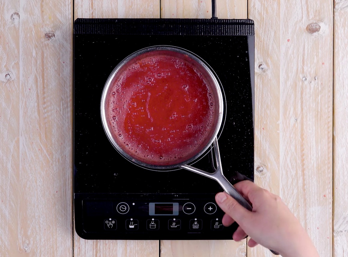 1.) Kümmere dich zuerst um das Erdbeerpüree, da es eine der Grundlagen für die nächsten Schritte bildet. Dafür gibst du die geviertelten Erdbeeren zusammen mit dem Zucker in einen Topf und presst eine Orange darüber aus. Lass alles zusammen einkochen, bis es eine sirupartige Konsistenz erreicht hat.