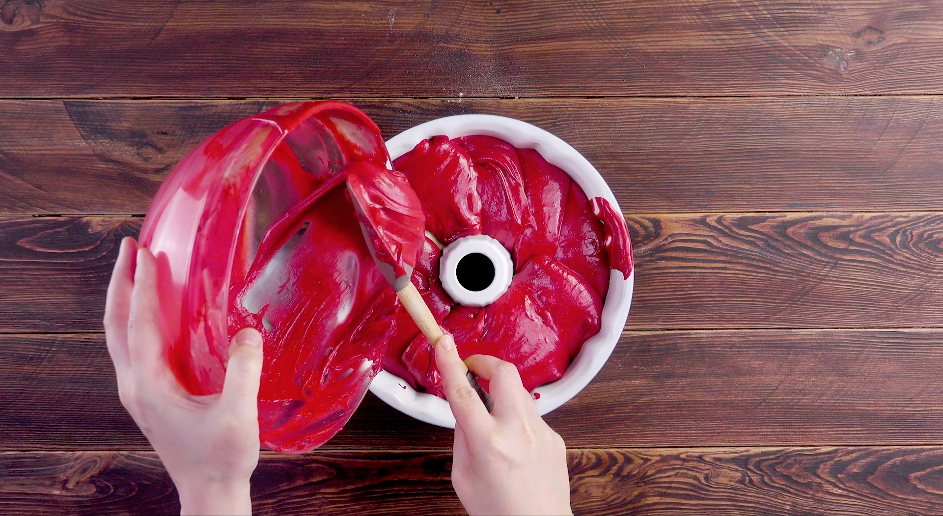 3.) Gib nun etwa die Hälfte des roten Teigs in eine gefettete Gugelhupfform und verteile darauf ringsherum mittig den hellen Teig. Spare dabei den inneren und den äußeren Rand aus. Gib nun den restlichen roten Teig darüber und streiche ihn glatt.