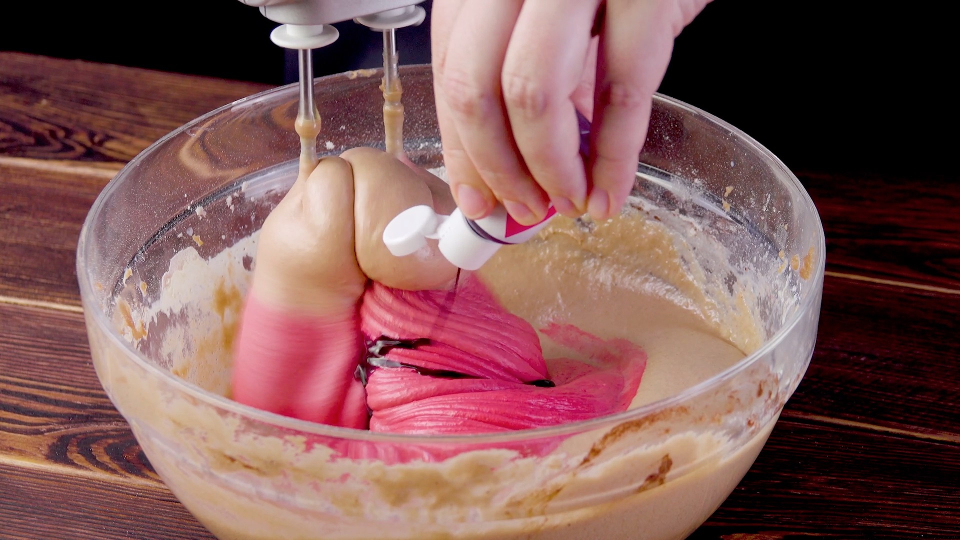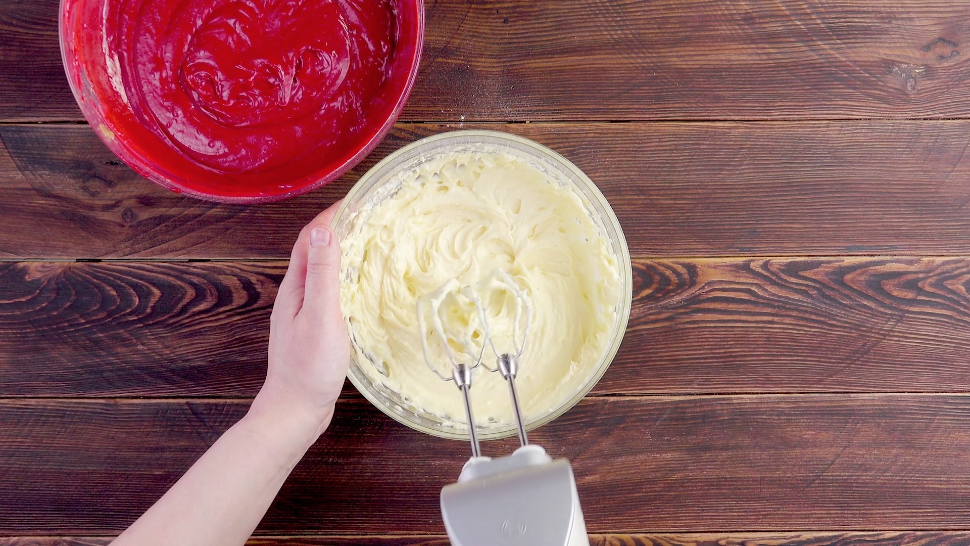 1.) Schneide für den roten Teig zunächst die Butter in Würfel und gib sie in eine große Schüssel. Dazu gibst du Mehl, Zucker, Kakao, Natron, Eier, Frischkäse und Vanille. Verrühre alles mit einem Handrührgerät zu einem glatten Teig und gib ein paar Spritzer Lebensmittelfarbe hinzu. Rühre weiter, bis der Teig eine gleichmäßige, bestenfalls tiefrote, Farbe erreicht hat.