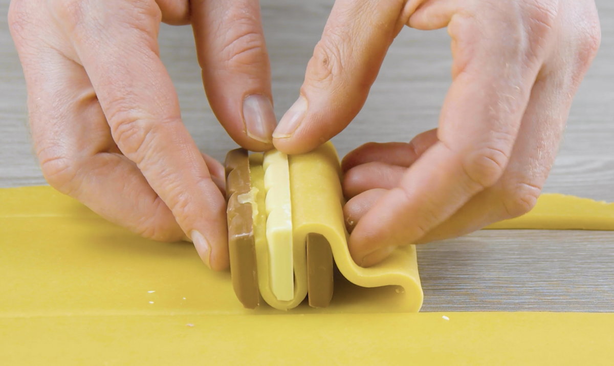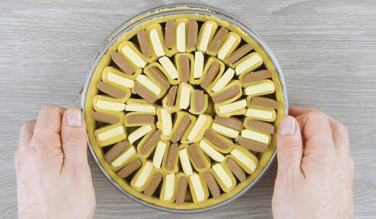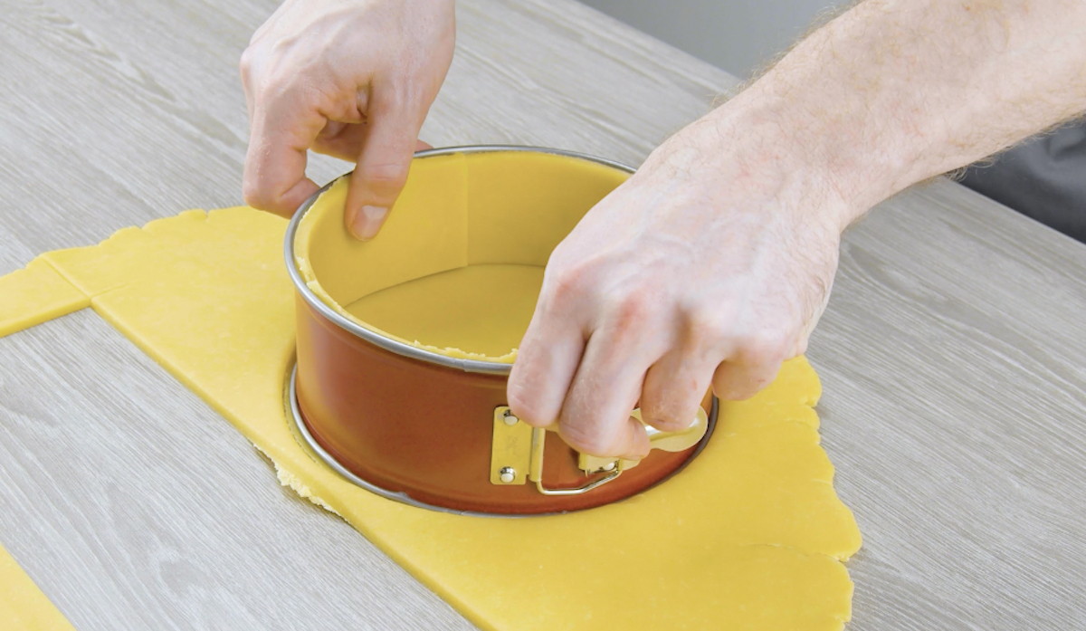 3. Rolle den Pastetenteig mit einem Nudelholz auf eine Dicke von ca. 0,5 cm aus. Kleide dann den Boden und die Seitenwände der Springform mit dem Teig aus und stelle die Form für ca. 30 Minuten in den Kühlschrank. Den Rest des Teiges rollst du erneut dünn aus und schneidest ihn in Streifen. Die Breite der Teigstreifen orientiert sich an derjenigen der Schokoriegel.
