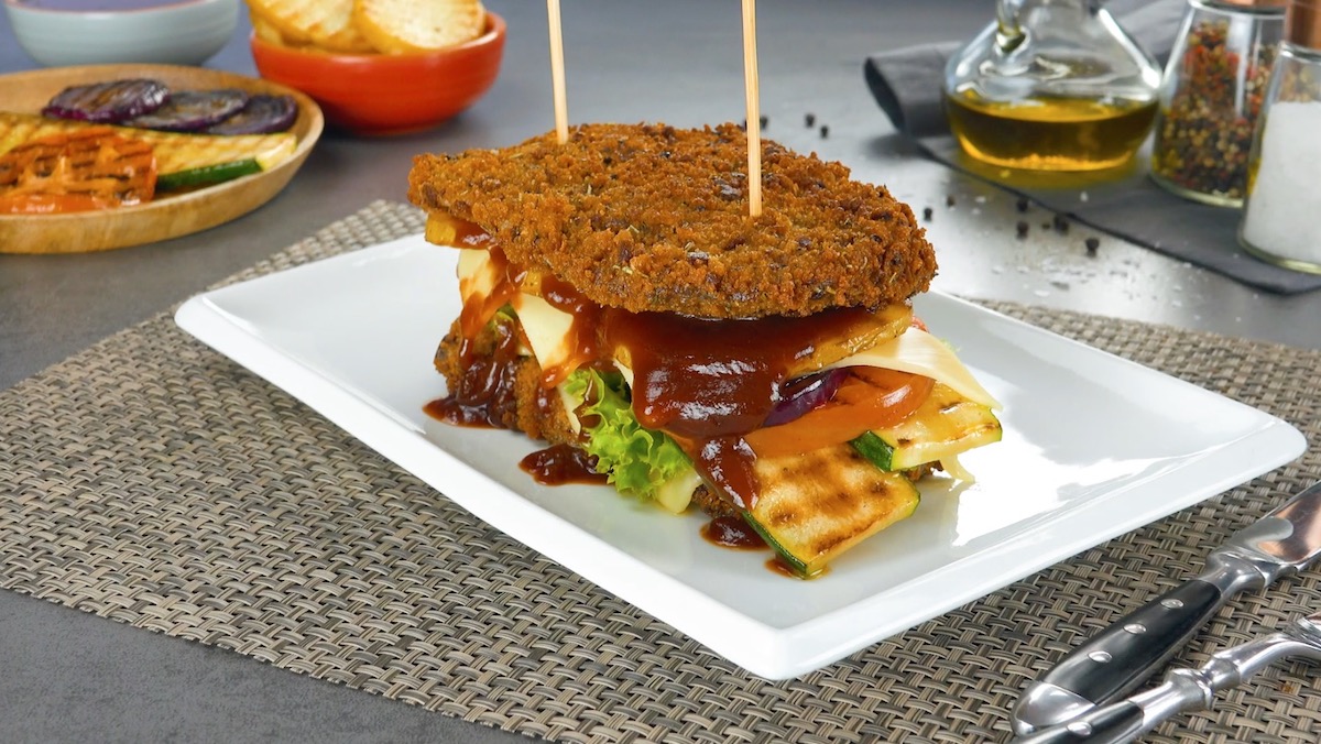 Echte Fleischliebhaber sollten dieses Sandwich dringend kosten, denn nie zuvor hat Rumpsteak, gehüllt in eine knusprige Panade aus Graubrot und belegt mit gegrilltem Gemüse, aromatischem Käse und würziger BBQ-Sauce, besser geschmeckt.
