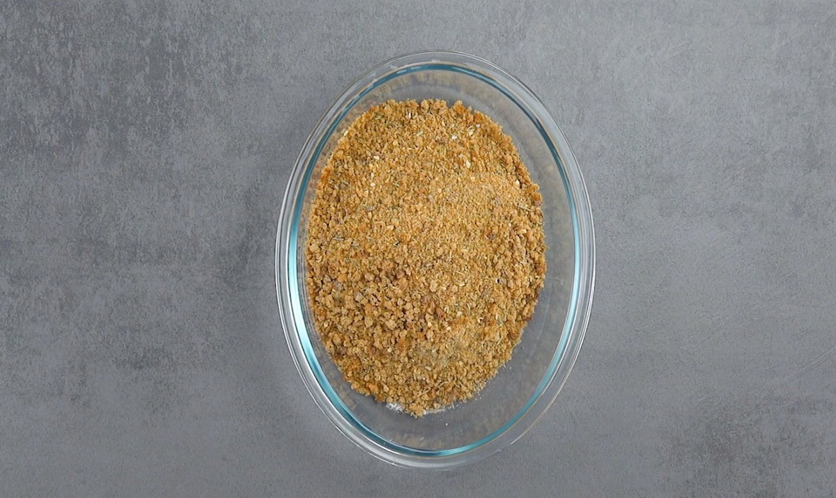 1. Trockne das Graubrot für 45 Minuten bei 100 °C Umluft. Warte, bis das Brot abgekühlt ist, und zerkleinere es zusammen mit Thymian, Rosmarin und Knoblauchpulver zu einer Panade; verfeinere diese nach Belieben mit Salz.