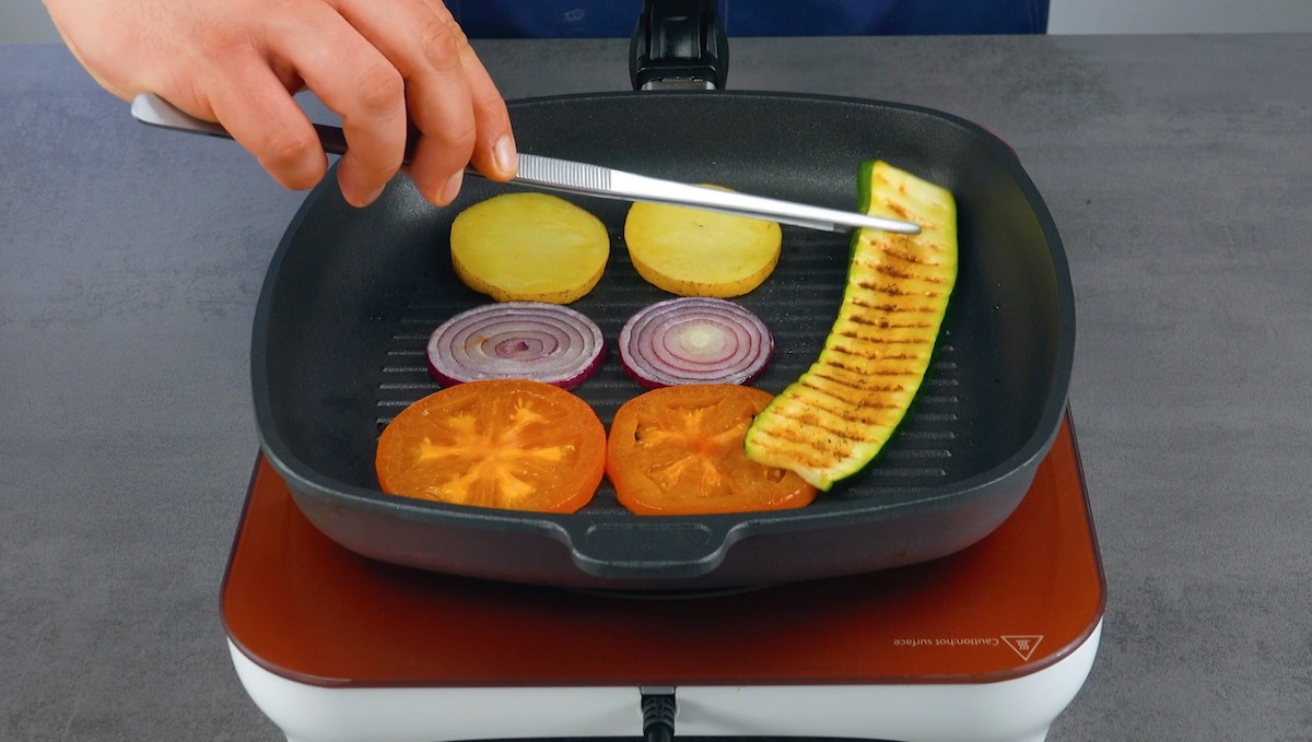 4. Brate Kartoffel-, Zwiebel-, Fleischtomaten- und Zucchinischeiben von beiden Seiten an.