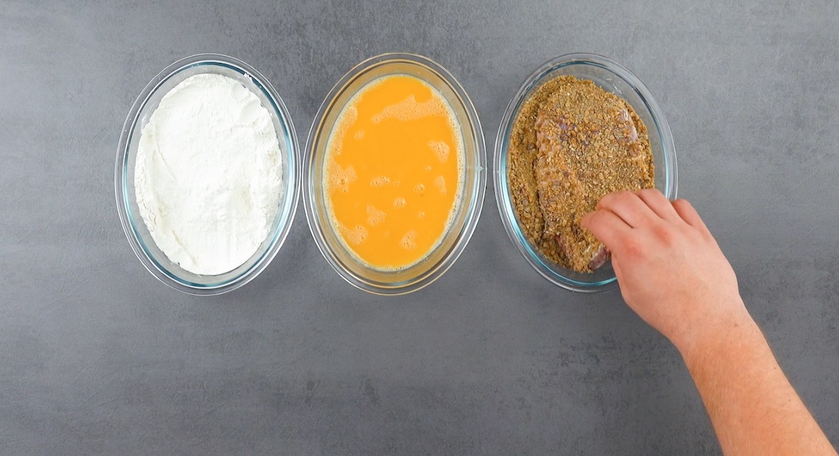 2. Schneide das Rumpsteak in zwei Scheiben à 150 g. Wälze diese dann in Mehl, verquirlten Eiern und anschließend in der selbstgemachten Panade.