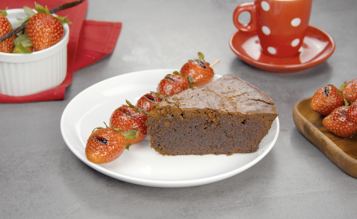 7. Serviere den Brownie vom Grill mit den Erdbeerspießen und – wenn du magst – mit Vanilleeis.