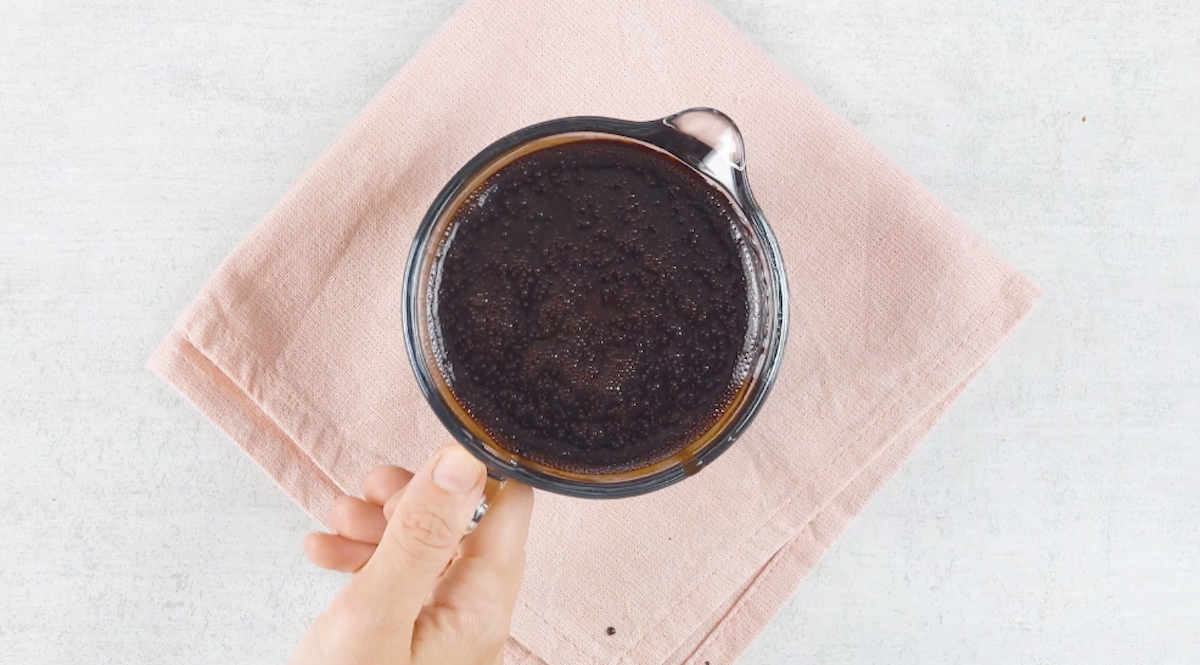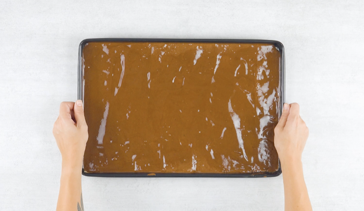 6. Am nächsten Tag kümmerst du dich um die Spiegelglasur. Koche Sahne mit Wasser und Zucker auf. Gib Kakao hinzu und verrühre alles mit einem Schneebesen. Erhitze die Masse auf exakt 103 °C. Fülle die Masse dann in einen Messbecher und lasse sie auf 60 °C abkühlen. Füge dann die Gelatinemasse hinzu und lass sie sich komplett auflösen. Verrühre alles mit einem Handmixer oder einem Schneebesen, achte aber darauf, keine Luft unterzuheben.