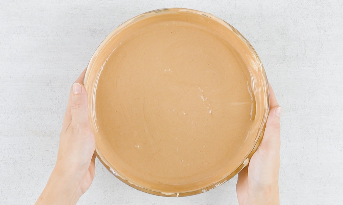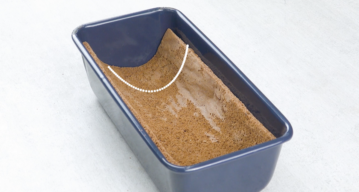 4. Verteile eine Schicht Schokomousse mit einem Löffel auf dem Kuchenboden. Streue dann die in Krümel gebrochenen Kuchenbodenreste auf die Mousse. Wiederhole das mindestens 2 bis 3 Mal, bis die Form gefüllt ist (abwechselnd Mousse und Krümel). Hebe aber noch ein bisschen Mousse für später auf. Zum Schluss kommt der Teigstreifen (der Boden) obendrauf. Drücke den Boden leicht an, sodass er von allen Seiten mit der Mousse bedeckt ist. Lege die Kuchenform nun für 3 Stunden in den Gefrierschrank.