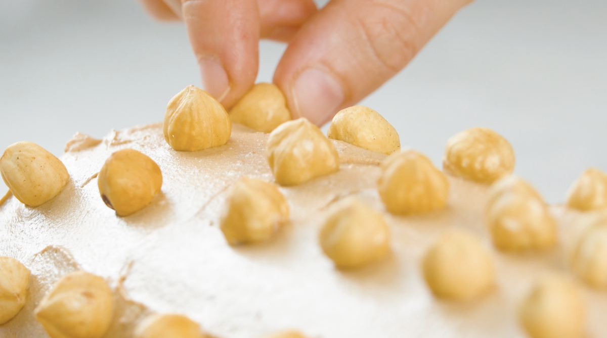 5. Stürze den Kuchen mit einem Brett und entferne die Papprolle. Trage dann die noch übrige Schokomousse als dünne Schicht auf den Kuchen auf und verteile darauf die Haselnüsse. Stelle den Kuchen dann für ca. 24 Stunden kalt.