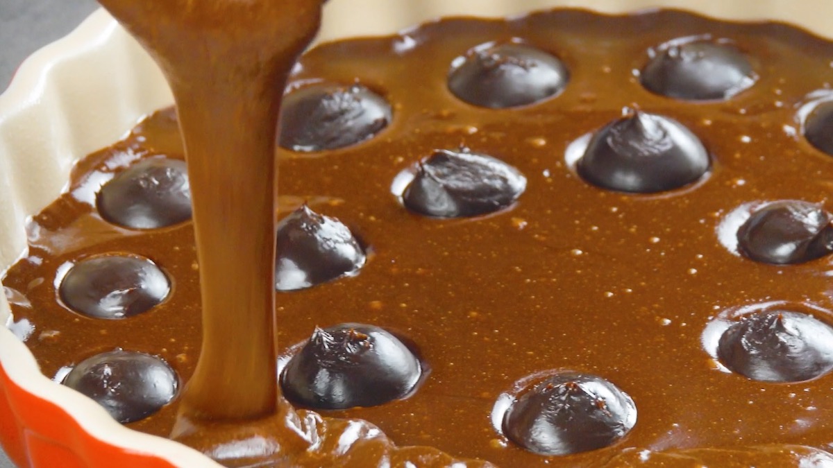 4. Fülle die Hälfte des Schokoladenteigs in eine Kuchenform. Verteile dann die Brigadeiros darauf und bedecke sie mit der zweiten Hälfte des Schokoladenteigs.
