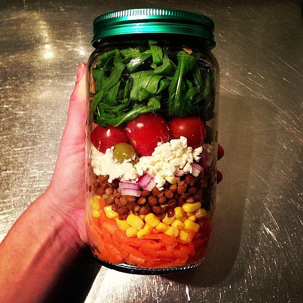- 4. Zuletzt das Eiweiß: Zutaten wie Tofu, Hähnchen oder Käse kommen ganz zuoberst ins Glas. Die schweren Zutaten helfen auch, den Salat und das Gemüse zusammenzupressen, so dass du das Glas noch weiter auffüllen kannst. Dann ab damit in den Kühlschrank.