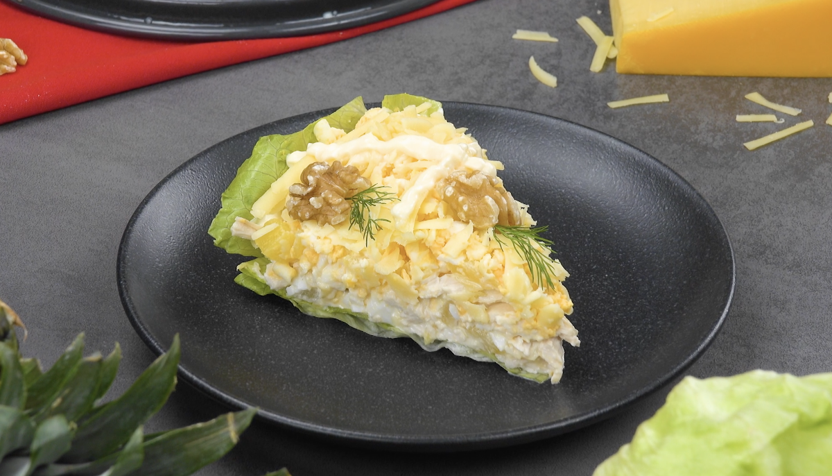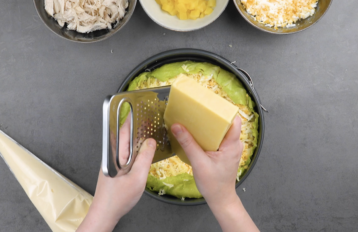 5.) Lege eine Springform mit Salatblättern aus. Gib eine Schicht Mayonnaise darauf, dann Hühnchen, dann Ananas und dann wieder Mayonnaise. Nun kommt eine Schicht geriebene Eier in die Form. Dann folgende Schichten: Mayonnaise, geriebener Käse, Mayonnaise, Hühnchen, Mayonnaise, Ananas, Mayonnaise, Eier und als Letztes geriebener Käse.