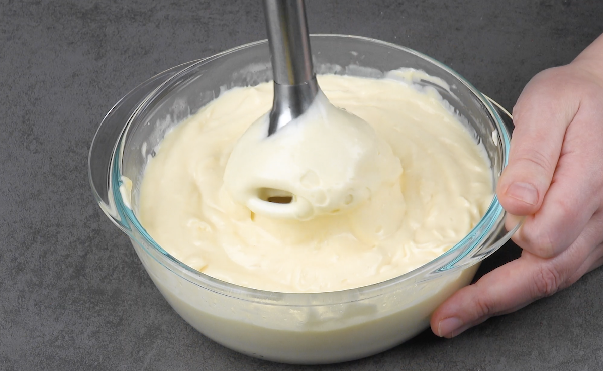 4.) Nun bereitest du die Mayonnaise zu. Gib dafür Öl, Knoblauch, Senf, Salz sowie Eier in eine Schüssel und püriere alles miteinander, bis eine homogene Masse entstanden ist.