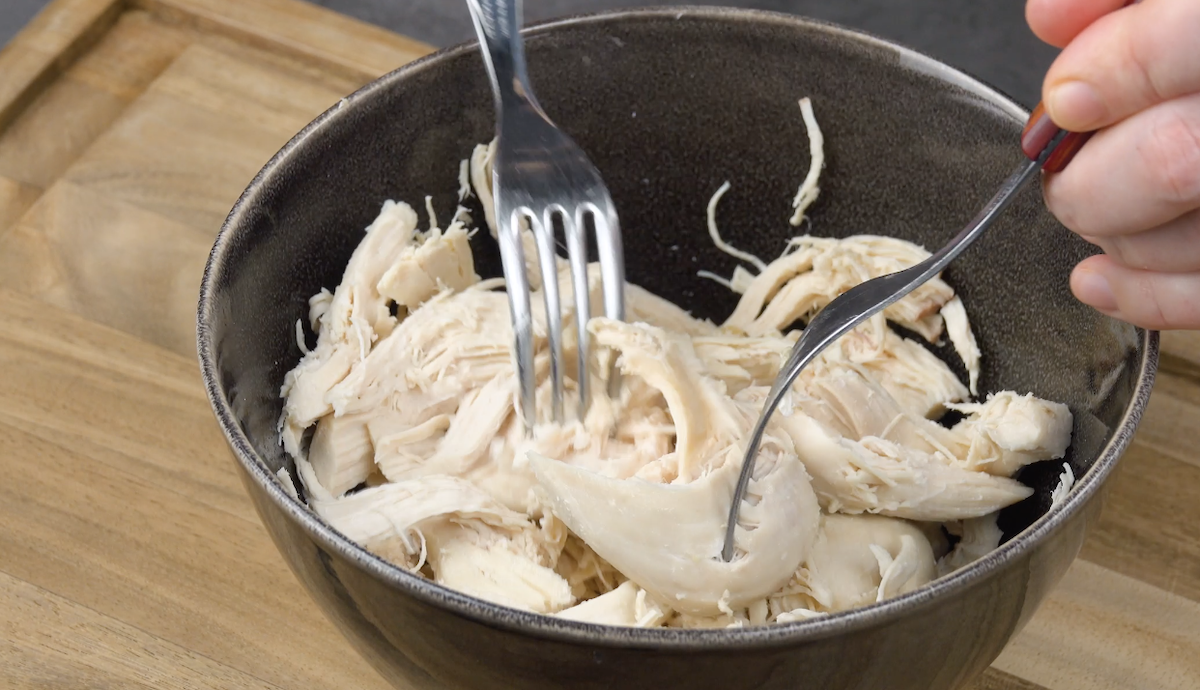 So geht es: 1.) Als Erstes kochst du die Hähnchenbrüste. Dann rupfst du sie mit zwei Gabeln in kleine Stücke.