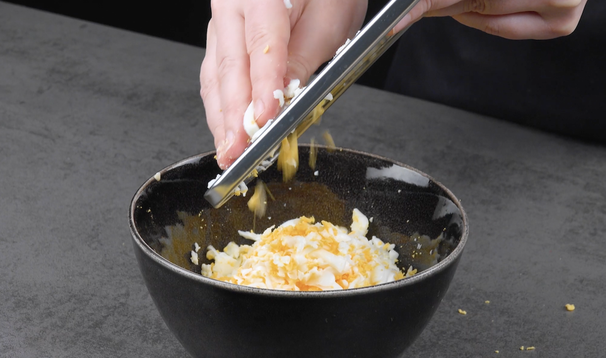 3.) Schäle alle Eier und reibe sie mit einer Reibe klein.