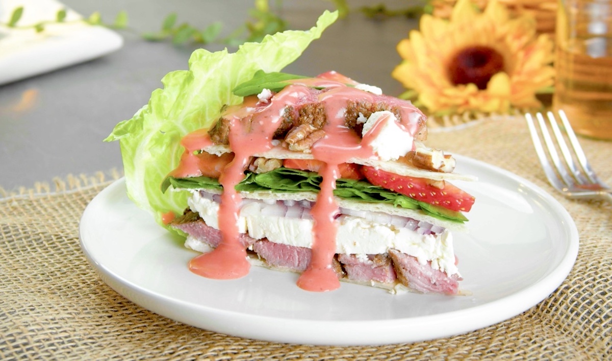 Tortillas, saftiges Rindersteak, Erdbeeren und Eisbergsalat in einem Rezept? Wenn du glaubst, dass diese Zutaten nichts miteinander zu tun haben, wird dich diese Salattorte vom Gegenteil überzeugen.