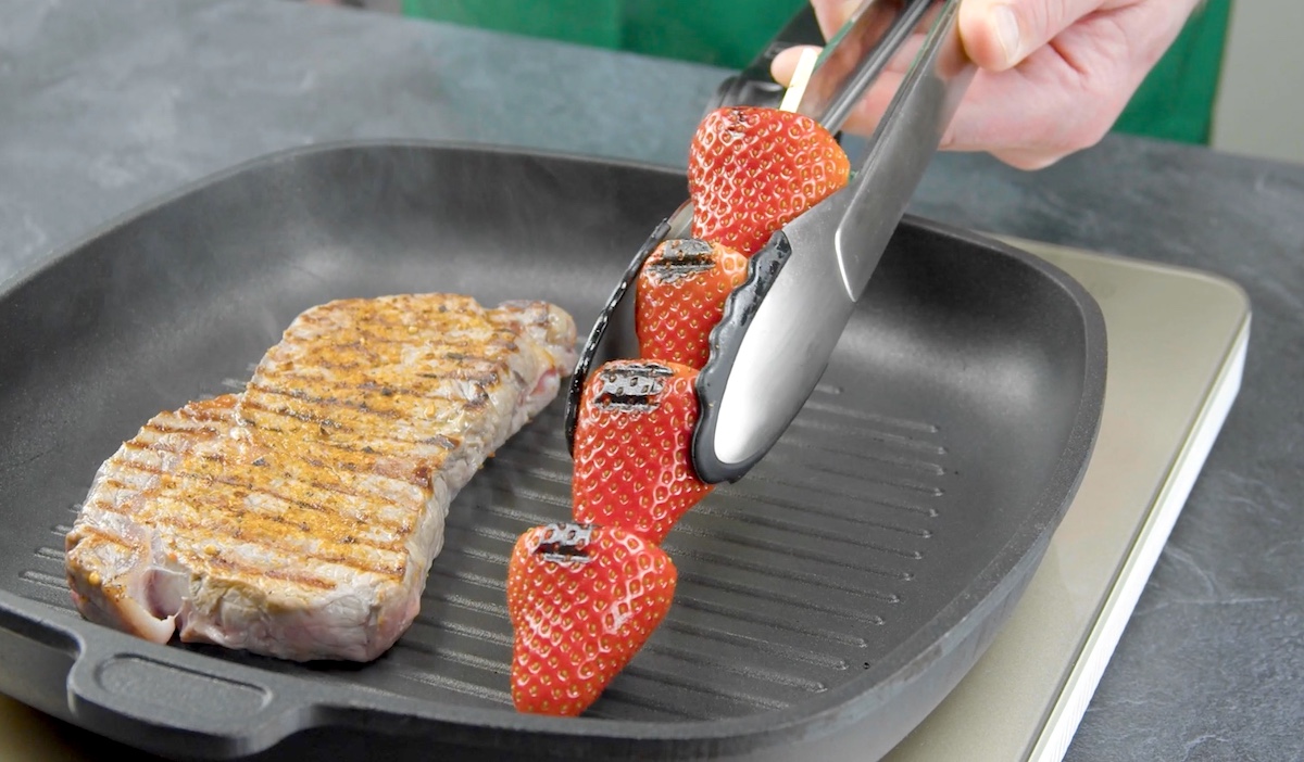 1. Schiebe vier Erdbeeren auf den Schaschlikspieß und würze das Fleisch mit Steakgewürz. Brate das Rindersteak pro Seite ca. 5 Minuten an, röste währenddessen auch die Erdbeeren mit an. Wickle das Steak anschließend in Alufolie und lass es 15 Minuten ruhen. Die Erdbeeren hebst du für das Dressing auf.