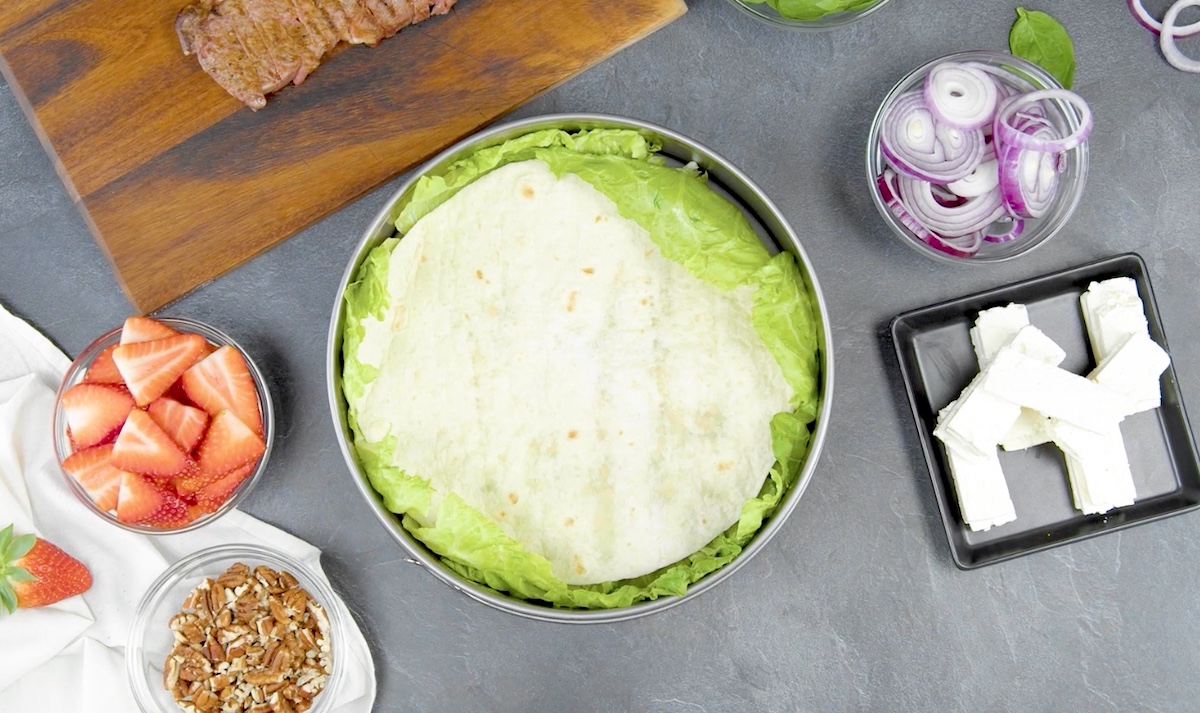 3. Kleide die Springform mit den Eisbergsalatblättern aus, sodass Boden und Ränder bedeckt sind. Lege dann eine Weizentortilla darauf.