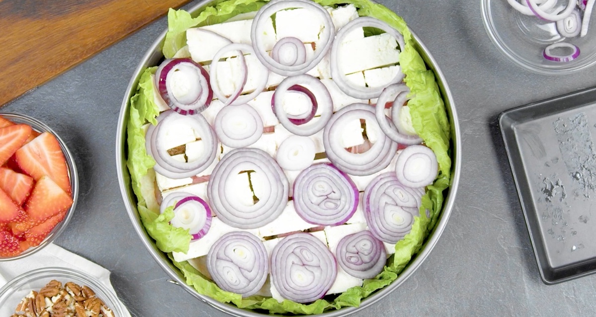 2. Schneide die roten Zwiebeln in Ringe, die restlichen sechs Erdbeeren und den Feta in Scheiben sowie das Steak in gleichmäßige Streifen. Röste die Pekannüsse kurz an und löse die großen Blätter vom Eisbergsalat ab.