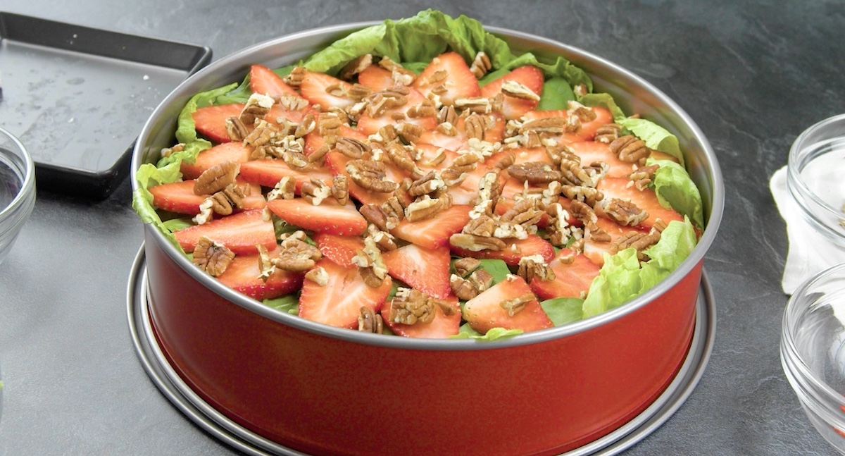8. Entferne nach der Kühlzeit den Rand der Springform und serviere die Salattorte zusammen mit dem Erdbeerdressing.