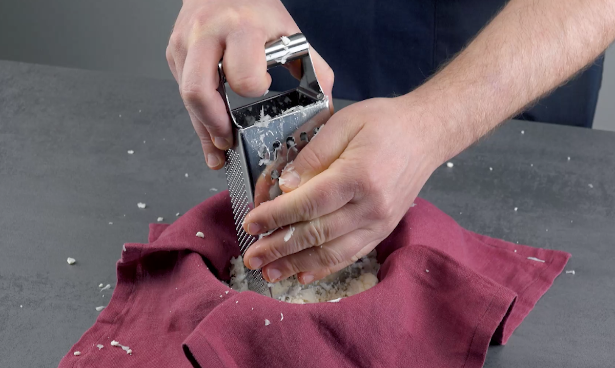 1.1 Zerkleinere den Blumenkohl mit einer groben Reibe und drücke mithilfe eines Geschirrtuchs die Flüssigkeit aus ihm heraus.