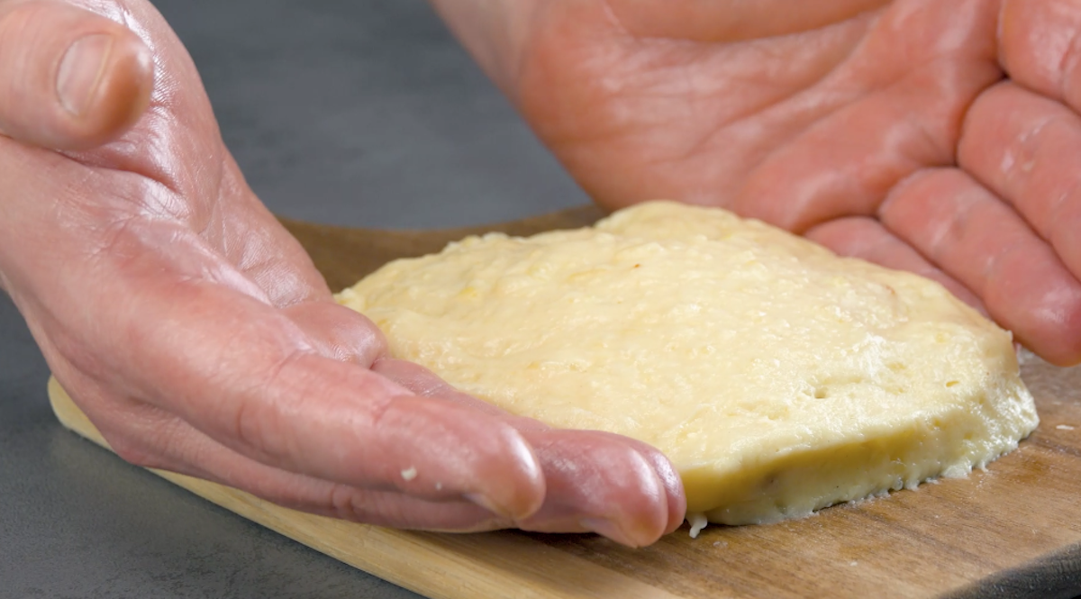 1.2 Gib den geriebenen Blumenkohl in eine Schüssel, füge Mehl, Semmelbrösel, Eier, Käse, Salz und Pfeffer hinzu und vermenge alles miteinander. Teile die Masse in acht gleich große Stücke und forme aus ihnen Rechtecke.