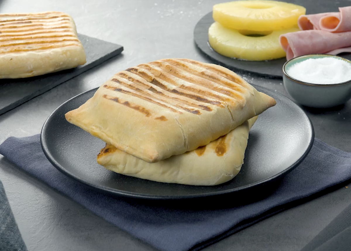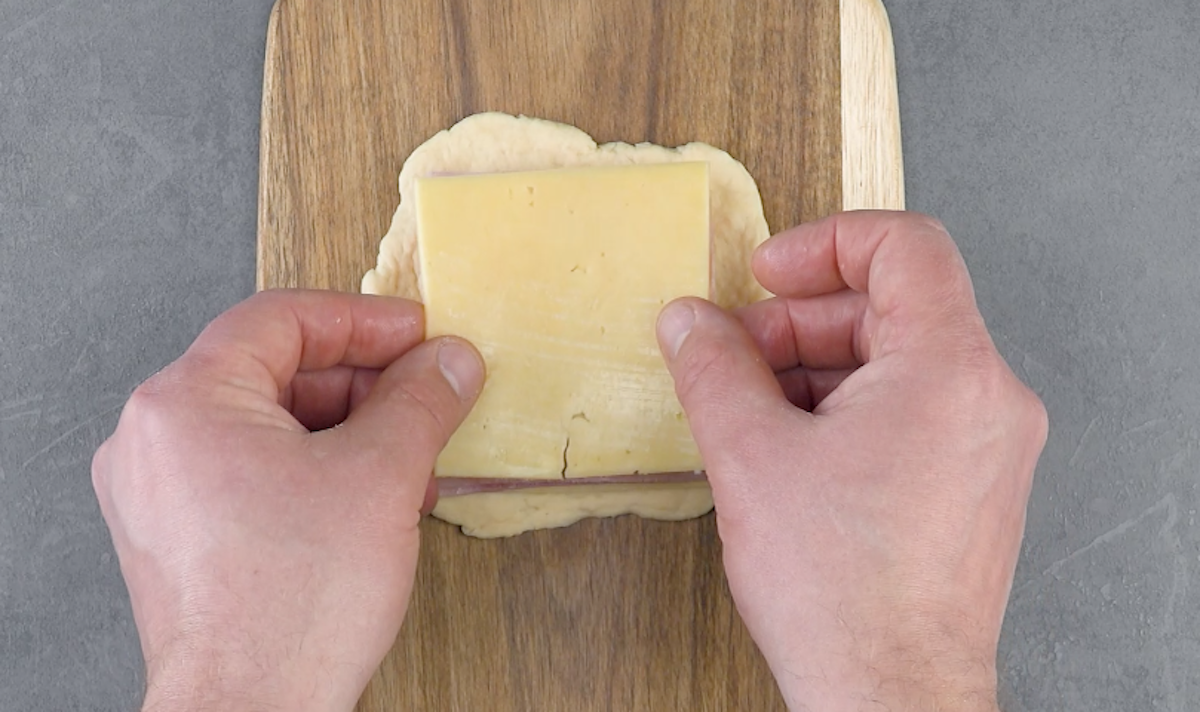 3.2 Lege auf vier der Rechtecke jeweils (in dieser Reihenfolge) Käse, Kochschinken, Ananas, Kochschinken und Käse, deckele das Sandwich jeweils mit den anderen vier Teig-Rechtecken und drücke die Ränder zusammen.