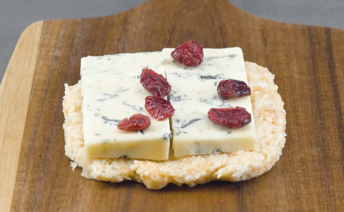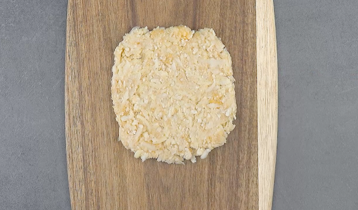 1.3 Belege vier der Blumenkohl-Rechtecke mit Gorgonzola und Cranberrys. Lege dann wieder ein Blumenkohl-Rechteck obendrauf. Drücke die Blumenkohl-Pattys dann an den Seiten zusammen.