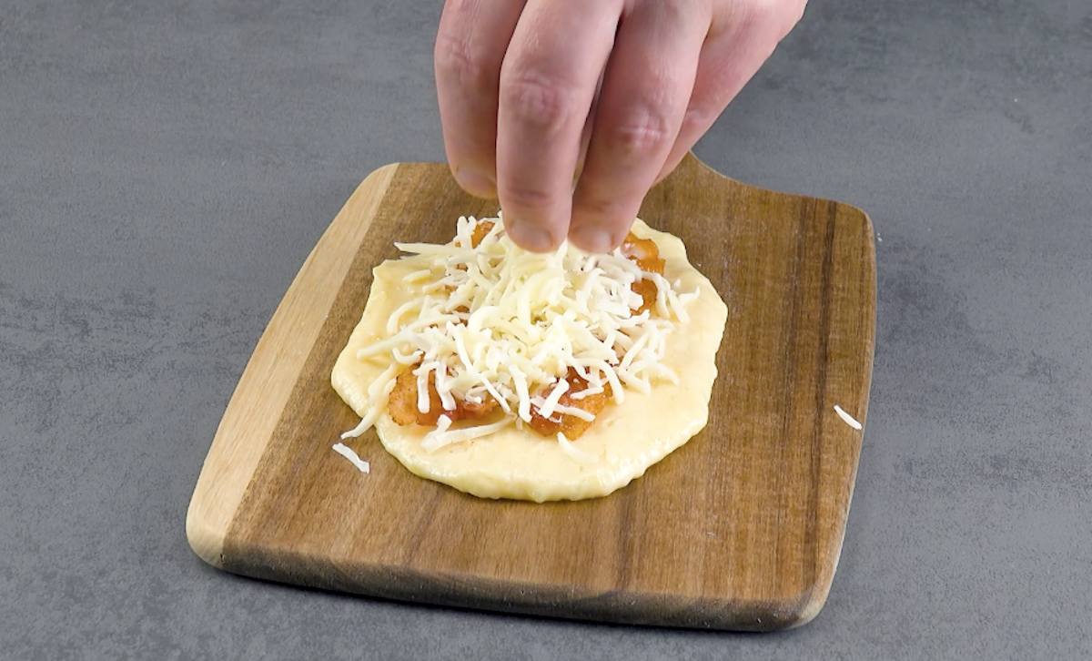 2.2 Teile die Masse in acht gleich große Stücke und forme aus ihnen jeweils ein Rechteck. Belege vier davon mit angebratenem Bacon und geriebenem Mozzarella.