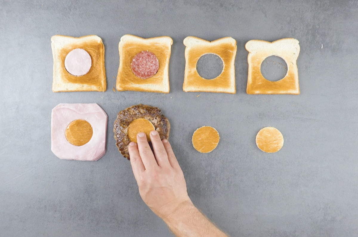 5. Brate das Hackfleisch an und stich aus ihm ebenfalls einen Kreis aus. Setze in das ausgestanzte Loch einen weiteren Kreis aus Toast.