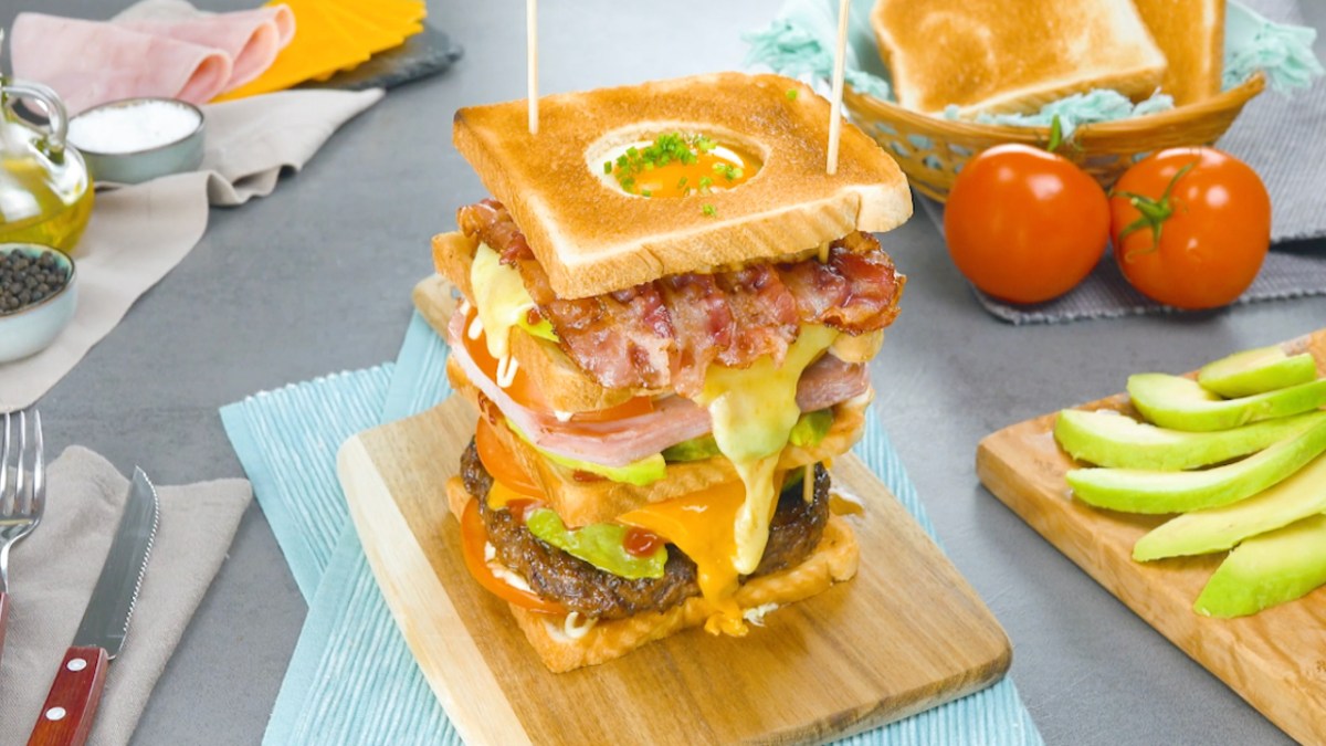 In diesem Fall kann man wohl sagen: je höher, desto besser. Der Sandwich-Turm ist der pure Genuss für alle, die Käse, Bacon, Avocado und Hackfleisch mögen. Ein Hochstapler, der bei jedem Essen ein gern gesehener Gast ist.