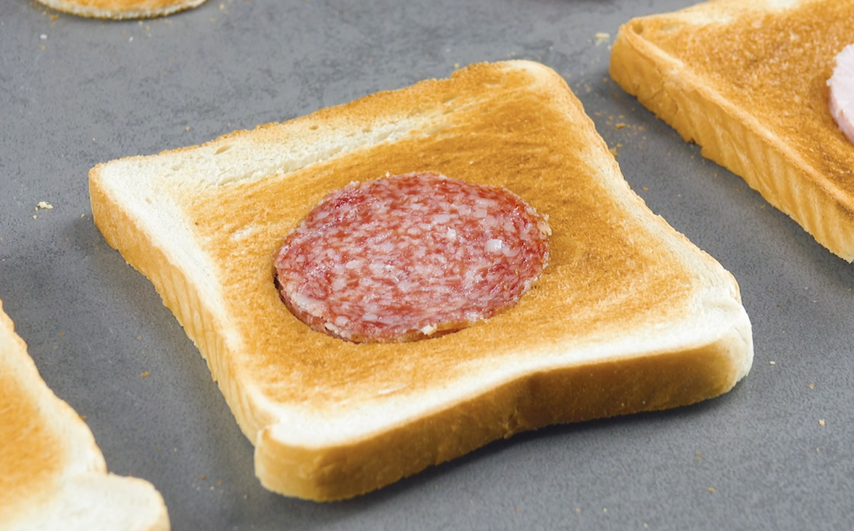 4. Lege 4 Scheiben Salami in die nächste Toastscheibe.