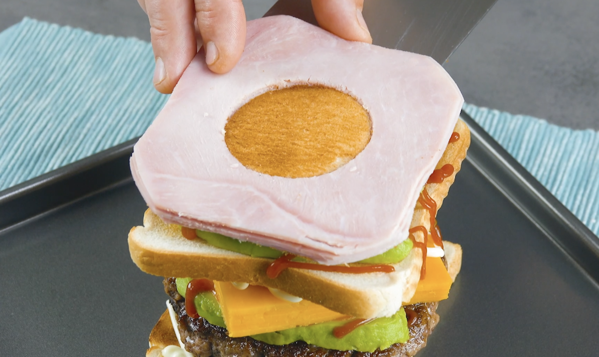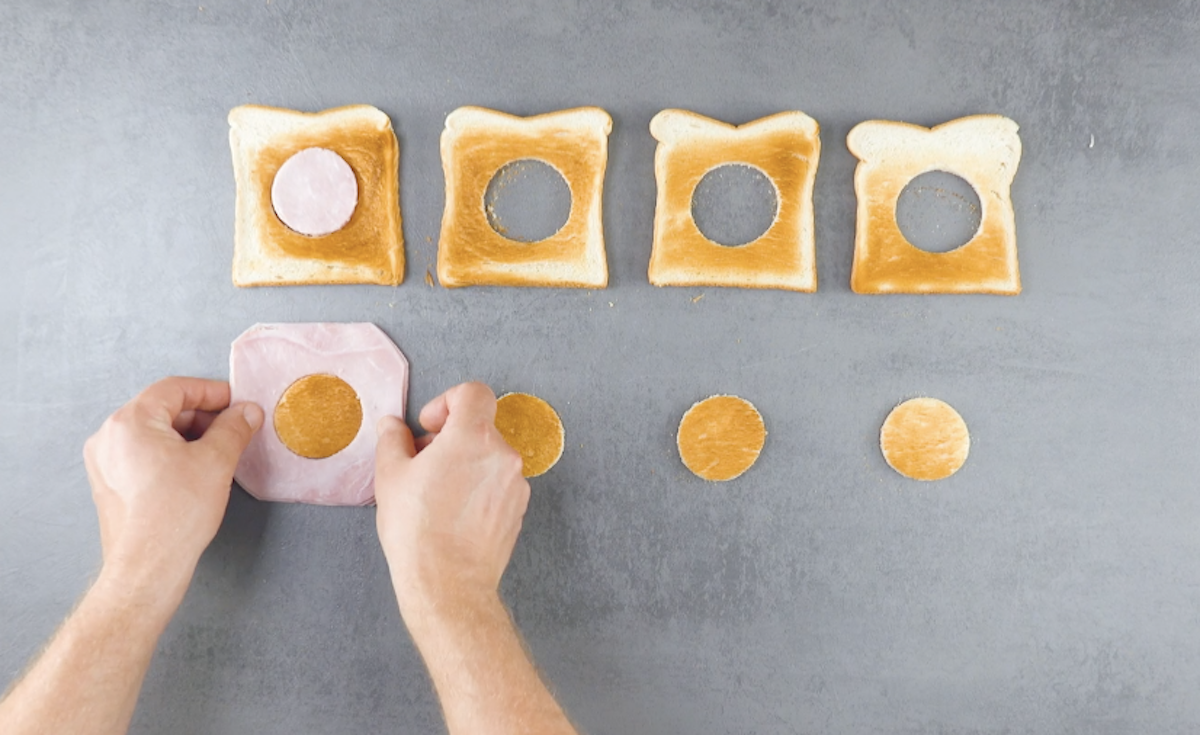 3. Lege 4 Scheiben Kochschinken aufeinander und stanze mit demselben Ausstecher ebenfalls ein Loch in deren Mitte aus. Lege den ausgestanzten Schinkenkreis in eines der Toastlöcher. Im Gegenzug setzt du einen ausgestanzten Toastkreis in den Schinkenstapel mit Loch.