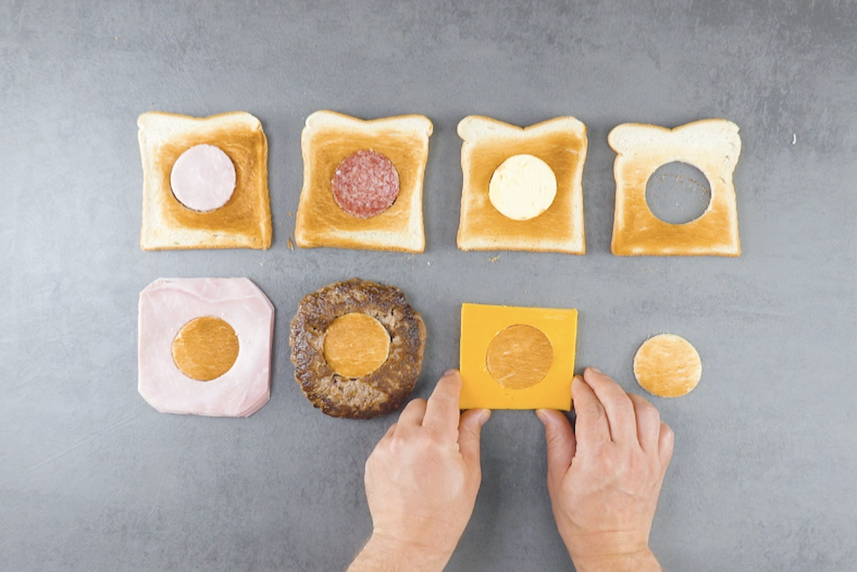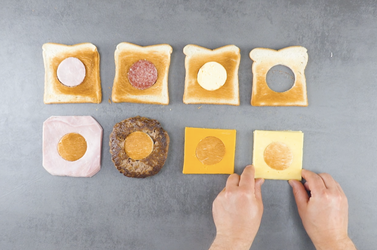 7. Lege den Cheddar übereinander und stich ebenfalls einen Kreis aus und fülle das Loch mit Toast.