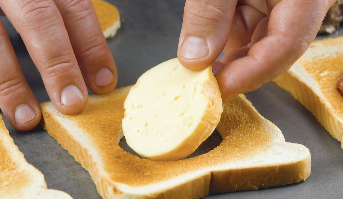 6. Setze in eine weitere Toastscheibe einen Kreis aus Camembert.