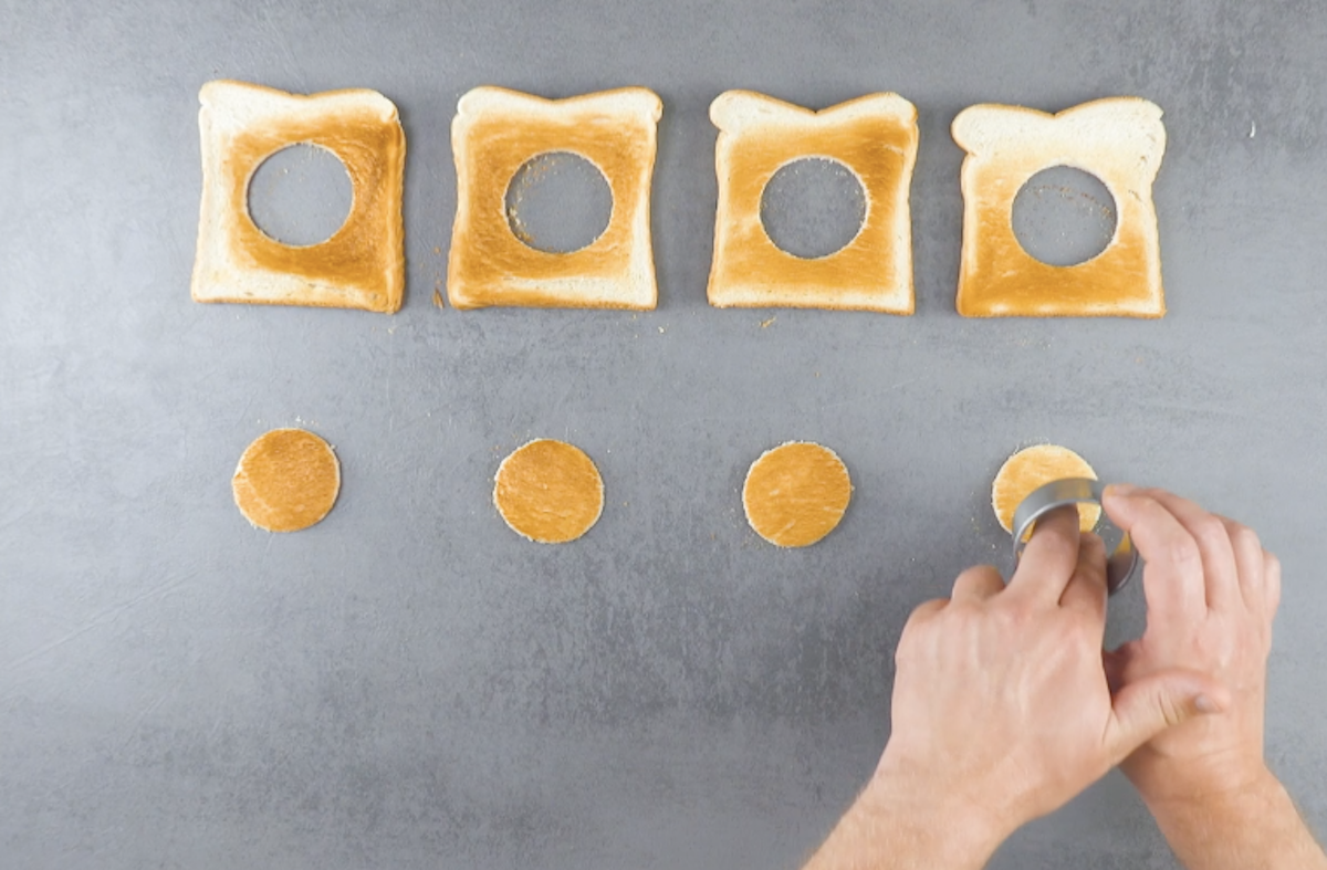2. Stich mit einem Ausstecher 4 Kreise aus den Toastscheiben aus.