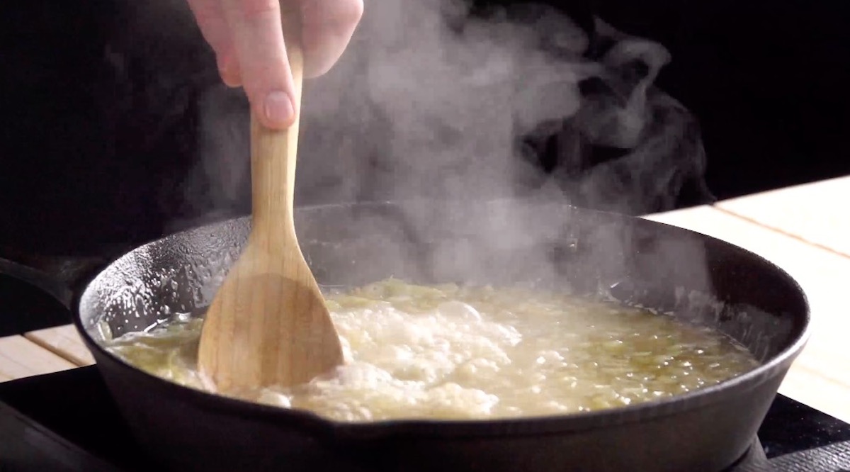 4.) Wische die Pfanne anschließend mit einem Küchentuch aus, erhitze reichlich Olivenöl darin und 45 die Zwiebel an. Rühre dann den Reis ein. Gieße anschließend ein paar Löffel der Hühnerbrühe in den Beutel, in dem noch ein Rest der Marinade ist, und dann alles, zusammen mit dem noch übrigen, großen Teil der Brühe, in die Pfanne. Gib nun Salz, Pfeffer und Oregano auf den Reis und lass das Ganze eine Weile einkochen.