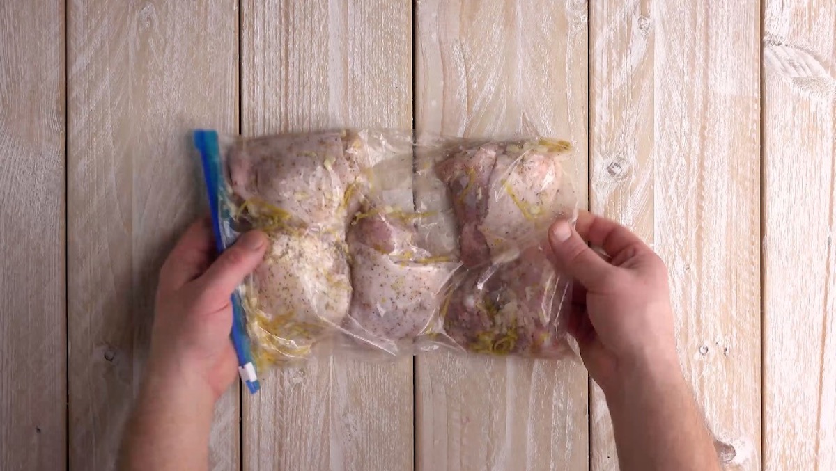 1.) Lege zuerst die gewaschenen und getrockneten Hähnchenschenkel in einen wiederverschließbaren Plastikbeutel. Schäle dann feine Streifen von der Zitronenschale ab. Am schnellsten und einfachsten geht das mit einem Zestenschäler. Die Streifen kommen dann zusätzlich in den Beutel.