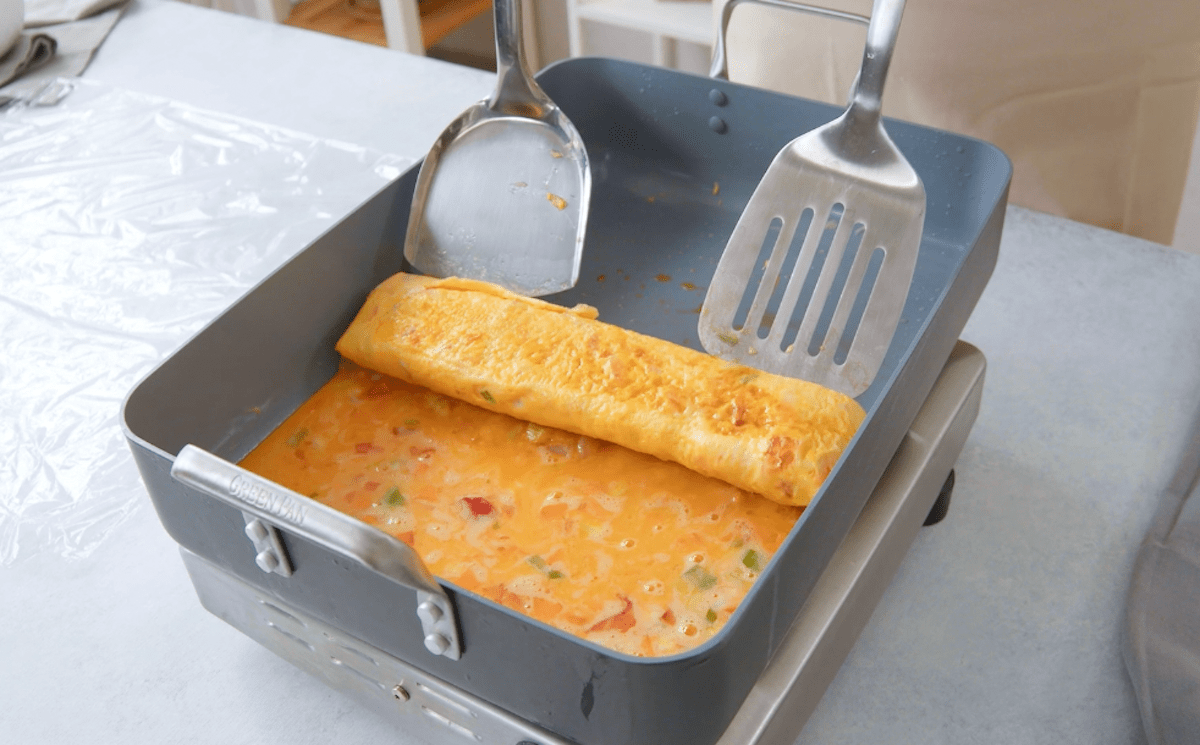 2. Erwärme Öl in einem rechteckigen Bräter auf mittlere Hitze, gieße dann ca. 3/4 der Eimasse hinein und lass das Ei langsam stocken. Rolle anschließend das Ei nach und nach mit zwei großen Bratenwendern zu einer Rolle auf. Wenn die Rolle halb zusammengerollt ist, gib auf die nun freie Fläche das restliche Viertel der Eimasse, lass auch diese stocken und rolle dann alles zu einer großen Rolle auf.