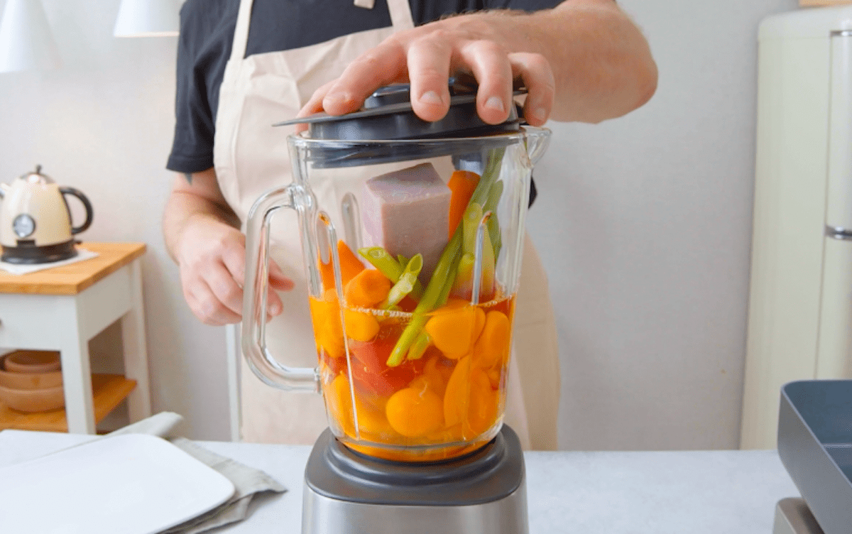 1. Gib Eier, Karotten, Paprika, Frühlingslauch, Kochschinken, Salz und Pfeffer in einen Standmixer und mixe alles in kurzen Intervallen – aber nicht zu lange, sonst wird die Masse zu fein.